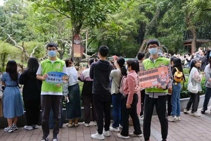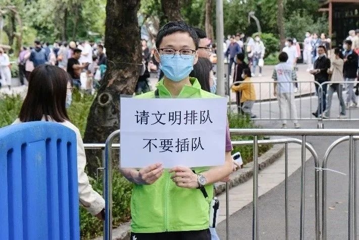 园区内动物场馆众多,游客摩肩接踵,工作环境较为复杂且艰苦。在引导客流的同时,同志们通过手持地图为游客提供分区指引和游览建议,并善意地劝阻插队、投喂动物等不文明行为。随着园内客流量持续增加,轮岗方式尚不能满足志愿服务需求。对此,轮休的同志自愿承担起物资派送、信息发布等工作,并时刻关注工作群发布的“缺人”信息,及时补位,确保志愿服务平稳、持续地进行。凭借紧密高效的沟通,同志们协助园内安保、饲养员等维持了游览秩序,并顺利地帮助多名游客找到走失的儿童。
