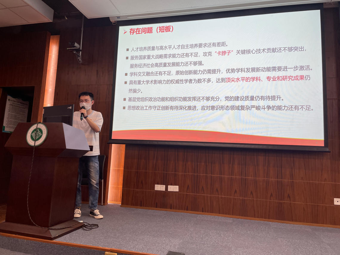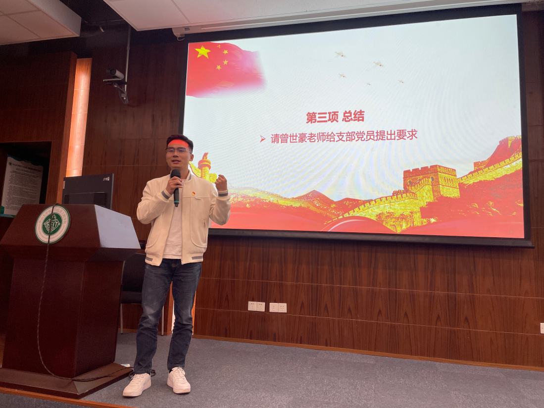 党务秘书曾世豪老师传达了学院党委关于学习贯彻主题教育的工作部署,并结合党支部建设提出几点建议:一是支委们应提高站位、履职尽责,以“系统性思维”统筹开展支部工作;二是创新组织生活形式与内容,支部内广泛开展调研,集思广益,探索打造支部品牌活动;三是增强支部凝聚力,精心设计支部活动,让支部所有成员参与进来,同时建立支部纪实档案,推动支部文化传承。