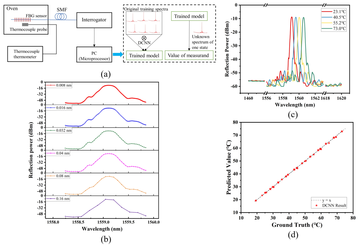 (a)实验验证装置示意图,(b)不同采样率下的光栅光谱,(c)不同温度下的光栅光谱,(d)通过深入卷积神经网络模型预测的温度值与设定值的比较