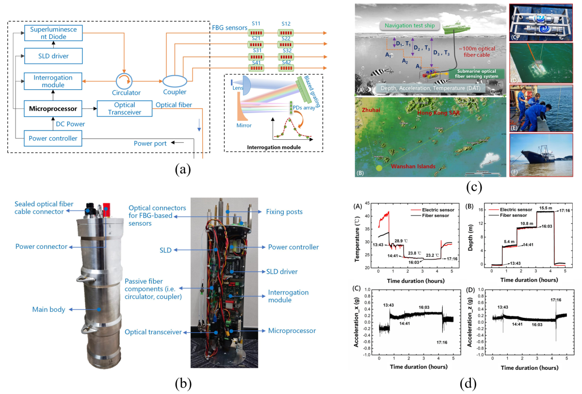 (a)海底多参量光纤传感器系统原理示意图,(b)研究中开发的水下多参量光纤传感器系统样机,
