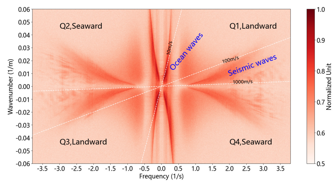 图 4 显示了基于我们的测试环境得到 频率波数 (f-k)谱,该数据集在距离三角岛 2 公里至 11 公里的 14 分钟内记录。通过f-k 谱,我们可以计算相速度作为不同频率的不同海洋声学信号的频率与波数之比,它描述了海浪传播特性。在 f-k 谱中,象限 1 和象限 3 显示具有正相速度的波,而象限 2 和象限 4 显示具有负相速度的波。相速度的符号表示海浪波沿光纤中传播的方向。从图中可以看到正值表示向东传播的波,而负值表示向西传播的波。由于大多数海洋表面重力波的频率分量低于 0.3 Hz,图中的象限 2 和 4 中的低频(< 0.3 Hz)的负相速度能量更多。说明在这个期间,向西传播的海面重力波强于向东传播的波,这与实际观测相符。此外,图 4中的白色虚线表示海面重力波的色散关系。这些测试数据表明它能为海洋的波浪与潮汐的监测提供一种新型的解决方案。