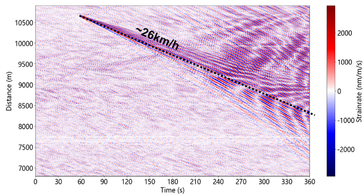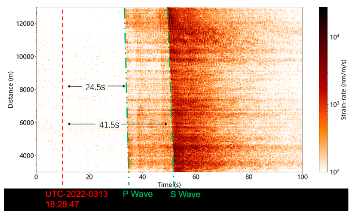 地面光纤分布式传感已成功用于检测地震,与传统的分离式海底地震仪(OBS)相比,它有传感元件数量多、潜在监测面积大、微震和远震检测的可能性等优点。如下图所示,UTC0 2022-03-13 18:28:47,我们观测了中国广东省惠州市附近海域(22.48°N,115.06°E)震中21公里MW 4.0地震记录。