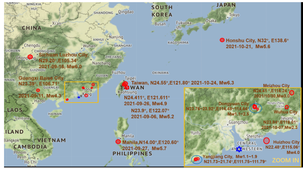 通过和广东省地震局报道的地震做对比,我们分析了2021 年 9 月和 2021 年 10 月期间检测到的一些选定地震。如图6显示在海底通信光缆成功检测到 在2021年9月和10月期间检测到的部分地震地图。如图6中国台湾沿海地震(24.55°N,121.80°E,2021-10-24,Mw 6.3),日本附近的近海地震(32°N,138.6°E,2021-10-21,Mw 5.6),菲律宾沿海(14.00°N,120.60°E,2021-09-27,Mw 5.7),广西内陆中国省 (23.39°N, 106.71°E, 2021-09-11, Mw 4.3), 中国四川省内陆一区 (29.20°N, 105.34°E, 2021-09-16, Mw 6.0).这些地震的震中距离我们的海底光纤有几百甚至几千公里。我们能够监测更多在广东省内的微震事件,因为这些震中与我们的海底光纤之间的距离约为 200 公里或更短,从而降低了地震的能量波传播损失,而更容易测量。我们在广东省发现了两个主要地震区,东源市附近地区(23.76°N - 23.92°N,114.48°E - 114.64°E)和阳江市附近地区(21.73°N - 21.74°N,111.75°E — 111.79°E),两者都位于沿海地区,在图 的插图中浅蓝色椭圆内,与广东省地震局 (GSB) 的记录一致。这些微震的震级都在Mw 2以下,最弱的是Mw 1.1。除了地震,我们的系统还可以检测到其他人工瞬态声信号,可以使用高级机器学习算法的频谱和时域分析将有助于将地震信号与其他干扰振动区分开来。