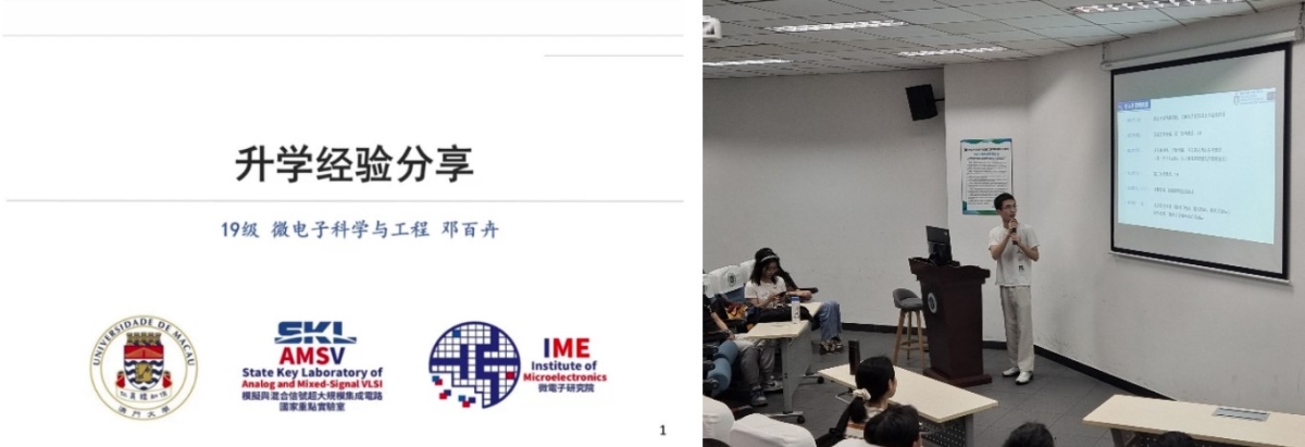 首先进行的是来自澳门大学的邓百卉同志的线上分享。邓百卉同志是小黄书 19级微电子科学与工程专业的同学,毕业后在澳门大学微电子研究院继续深造。邓百卉同志为大家介绍了澳门大学微电子研究院的基本情况,并分享了自己在升学申请过程当中的经验和注意事项。此外,来自香港科技大学(广州)的陈培宇同志就个人升学时间线为本科同学展示了自己的申请过程,向大家分享了如何去确立目标和做出准备,并提醒大家要多了解学校和课题组的详细信息。