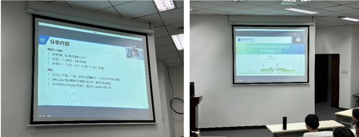 来自复旦大学信息科学与工程学院的何雨涵同学和中国科学院半导体研究所的张驰同学通过线上的形式,分享了推免和面试的经验。何雨涵同学为大家梳理了保研推免的时间线,分享了夏令营的申请经验,并建议具有保研资格的同学在保持绩点的同时,要注意丰富自己的比赛和项目经历,注重专业基础知识,勇敢尝试各大名校的夏令营。另一方面,张驰同志同样结合自己的保研经历,对保研申请的关键结点做了介绍和说明。张弛提到,保研过程中院校信息很关键,要时刻关注目标院校的最新通知与招生动态。张驰还为大家介绍了中科院体系和中国科学院大学的关系,向大家分享了本专业可以尝试报考的相关研究所。