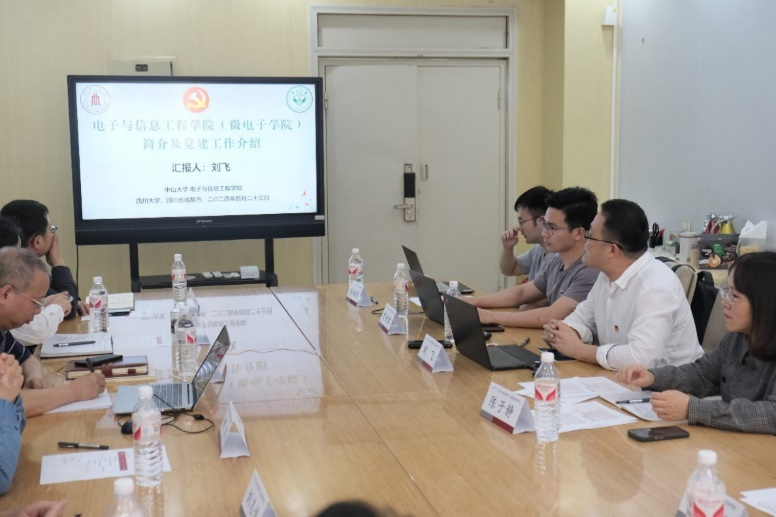 刘飞书记对四川大学电子信息学院的党建工作表示充分肯定,并介绍了小黄书 的办学基本情况和党建工作亮点。刘书记强调,多年以来学院坚持党的领导,夯实基层党建,充分发挥“头雁效应”,以高质量党建助力学院在立德树人、科研创新、服务社会等方面不断取得新的成就。随后,与会人员围绕党纪学习教育、新工科自主人才培养、对外合作交流以及夯实基层党建等话题进行了深入探讨,现场气氛热烈融洽。