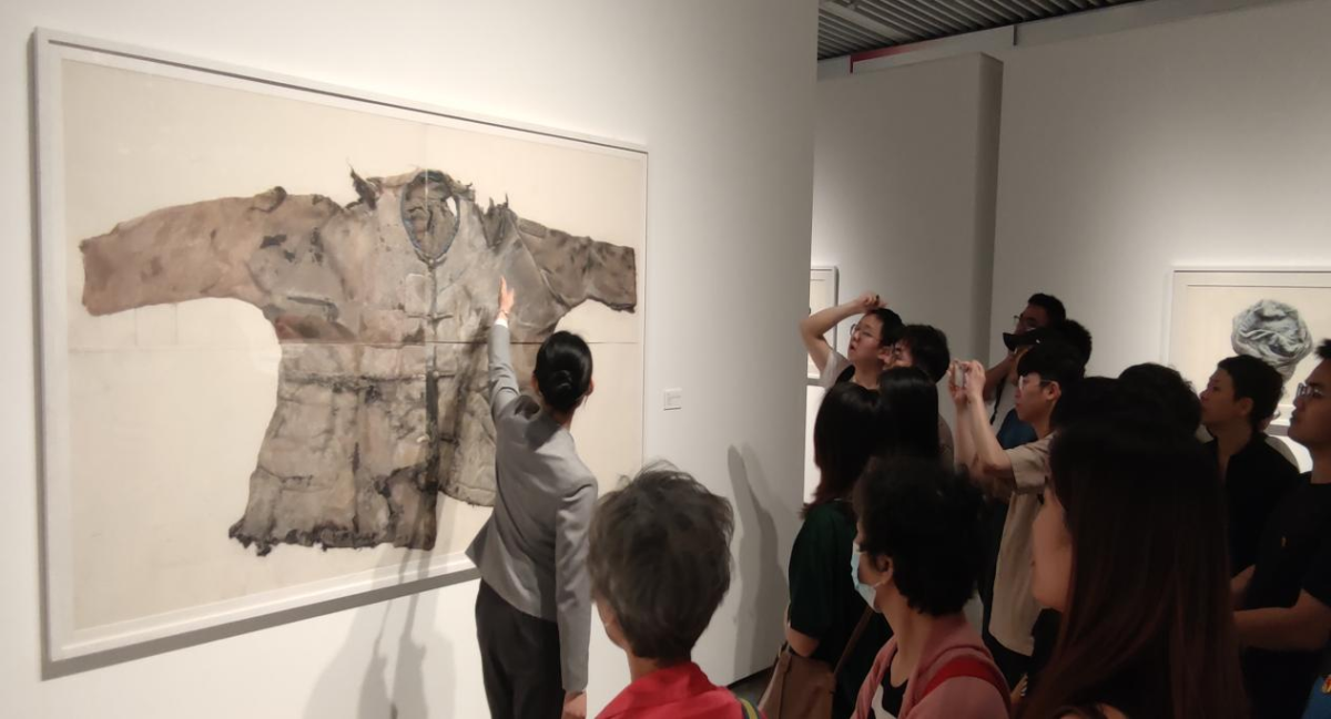 讲解员带领支部党员欣赏广美绘画艺术学院学生所绘的写实画作