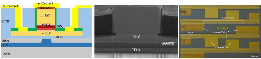 王瑞军、蔡鑫伦、余思远课题组在国际上率先开发出III-V族半导体材料与薄膜铌酸锂光子芯片的混合集成晶圆键合技术,利用光电材料与技术国家重点实验室的微纳加工平台摸索出一整套的器件加工工艺,解决了高折射率对比差波导体系中有源波导与无源波导耦合难题,研制出片上集成的半导体激光器,激光器片上最大输出功率超过2 mW,探测器响应度达到0.38 A/W。同时,利用薄膜铌酸锂光子集成芯片与III-V族光增益芯片的混合集成,基于热光效应研制出O波段调谐范围超过40 nm的外腔激光器,实现了与带宽超过50 GHz电光调制器的混合集成。行业内知名期刊《Semiconductor Today》以标题“First electrically pumped lithium niobate/III-V laser”对该工作进行了专栏报道。相关论文发表后被瑞士洛桑理工学院Tobias J. Kippenberg、美国加州大学圣芭芭拉分校John Bowers和哈佛大学Marko Lončar等国际著名团队在《Nature》等论文中引用百余次。