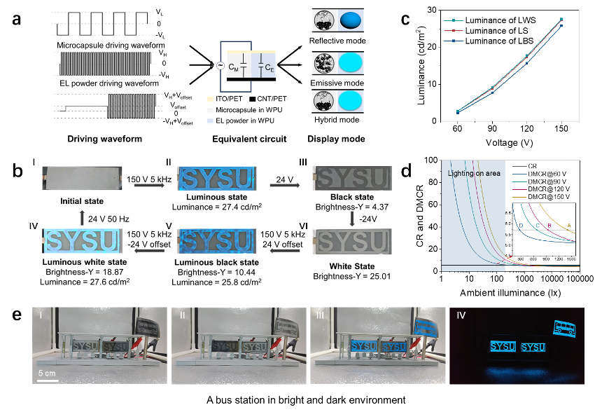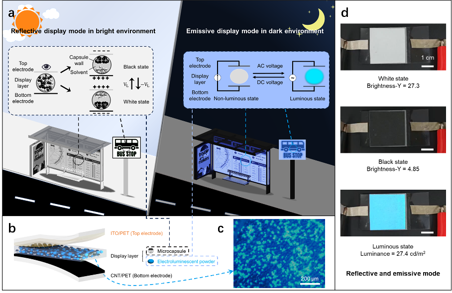 电泳式电子纸是目前应用最为广泛的反射式显示器件之一,其独特的双稳态(Bistability)特性令其无需持续供电便能保持图案和信息的显示,这使得电泳式电子纸具有极低的能耗,已广泛应用于公交站牌、指示牌和商场价签等场景。然而如何使电泳式电子纸在弱光环境下依旧保持良好显示效果的相关研究较少。研究团队研发的集成交流电致发光技术电子纸通过将电泳式微胶囊与交流电致发光粉末均匀掺杂于水性聚氨酯(WPU)材料中,基于两种显示材料的驱动信号不同,可以在同一显示器件中实现反射模式和发射模式的简单切换,兼具良好显示效果。(图2)