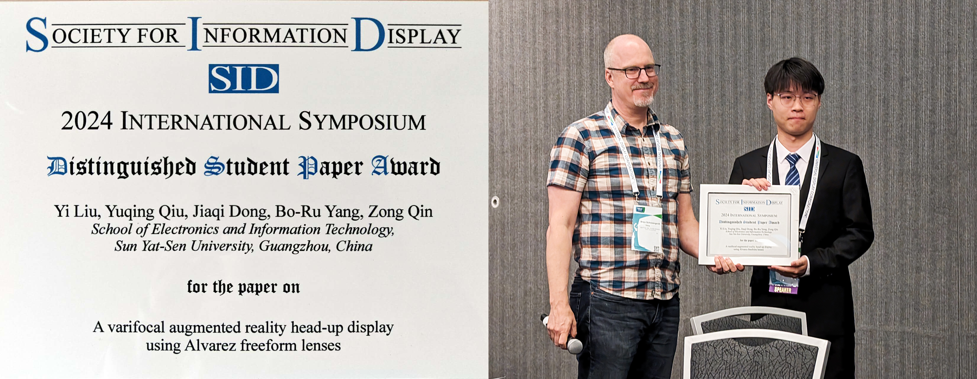 该项目主要参与人员还包括刘一同学(小黄书 2018级光电本科,2022级电子科学与技术硕博连读)和董家麒同学(小黄书 2017级光电本科,2021级集成电路工程硕士)。并且,该项目的研究成果于2024年以论文《Varifocal augmented reality head-up display using Alvarez freeform lenses》在美国圣何塞举办的显示领域顶会SID Display Week获得Distinguished Student Paper Award,刘一同学为第一作者。该奖项获奖率低于5%,获奖人来自斯坦福大学、中佛罗里达大学、Google、Meta、索尼、京东方等一流单位。