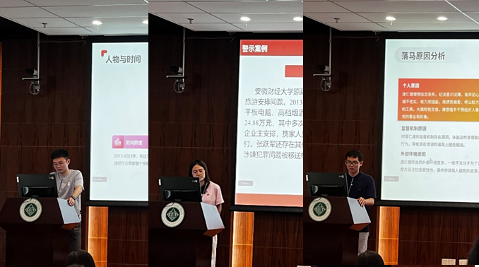 在案例剖析环节,三位支部书记结合真实案例,以案释纪、以案明规。博士第一党支部书记彭琢雅分享了甘肃省天水市卫健委原一级调研员李姝的违纪案例,揭示其从违规宴请到权钱交易的堕落轨迹,强调“小节失守终致大节不保”。博士第三党支部书记刘笑霖通过安徽财经大学原副校长张跃军违规收受礼品礼金案例,警示党员“思想防线一旦松动,腐败侵蚀无孔不入”。光学工程第二党支部书记钟富荣以农业农村部原党组书记、部长唐仁健违纪案为例,剖析其奢靡享乐、权力异化的深层原因,呼吁党员“慎独慎微,净化社交圈”。