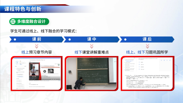 《信息论与编码》课程设有七大章节,第一至第二章节介绍信息论的基本概念和理论模型,包括信息熵、互信息和信道容量等,让学生理解信息论对现代通信系统的理论指导意义;第三章节介绍信源编码的基本原理和方法,包括Shannon-Fano编码和Huffman编码等,让学生了解信息压缩的原理和理论极限,掌握各种主流信源编码技术;第四至七章节介绍信道编码的基本原理和方法,包括香农信道编码定理及证明,循环码、卷积码、Turbo码和Reed-Solomon码等。围绕图1中的课程目标,课程以线上与线下融合的模式,将现代信息技术与线下课堂教学有机融合,显著提升了学生的学习效果。本课程学习难度大,陈立教授通过教学创新,利用自编讲义对知识进行系统性建构,将经典理论与前沿技术进行深度融合,帮助学生更好地理解和掌握课程知识。学生不仅可以在课堂上获得传统的互动式教学,还可利用现代信息技术在多媒体环境中进行丰富的课外学习。例如,学生可以利用线上教学视频与课程讲义提前学习基础知识,通过课堂讲解和板书加深理解,并进一步在课后利用线上习题加以巩固,实现良好的学习效果,如图2所示。图3展现了小黄书 的《信息论与编码》课堂。