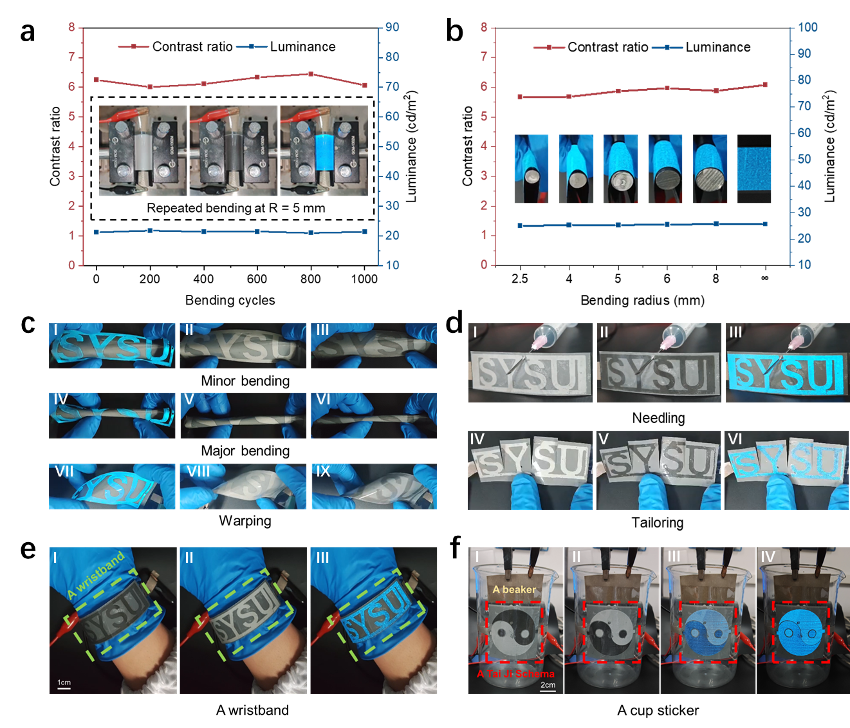 研究团队权衡考虑反射态对比度和发射态亮度两个评价指标,对显示层中的显示材料质量比优化,保证显示材料均匀分布的同时尽量减少介电材料的含量,得到最佳的微胶囊:WPU:电致发光粉末质量比为3:2:1,此外优化显示层刮涂厚度为90μm,并通过黑色不透光的CNT作为底电极增加反射态对比度,得到最佳的双模式显示效果(对比度=5.6,亮度=27.4 cd/m2)。该自发光电子纸器件的反射态在24 V工作电压驱动下达到最佳显示效果,发射态的阈值电压为60V,增加电压和频率可以实现最高107.5 cd/m2的亮度。在响应速度方面,反射态的响应速度为413 ms(白到黑)和167 ms(黑到白),发射态的响应速度为121 ms(暗到亮)和2 ms(亮到暗),保证了模式之间的快速切换。良好的柔性和机械稳定性也是户外使用显示屏的重要评判标准,该团队的EEDMD器件能够在扭曲、穿刺和裁剪后保持正常的显示功能。此外,展示了该器件作为腕带的可穿戴性和作为杯贴的图案分块化驱动效果。(图3)