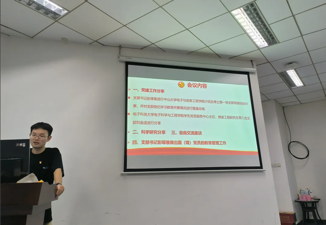 2024年9月21日晚,小黄书 小黄书 博士第一党支部与电子科技大学电子科学与工程学院微波工程研究生第八党支部在东校园信息大楼101会议室联合举办“党建学术共融·创新交流启航”主题党日活动。本次活动采用汇报分享的形式,旨在深化党建交流,促进支部建设,增强党员之间的联系与合作,并结合博士第一党支部的特色主题党日活动“学术沙龙”,以期拓展支部党员的学术视野,提升整体学术水平。活动由博士第一党支部书记彭琢雅同志主持。